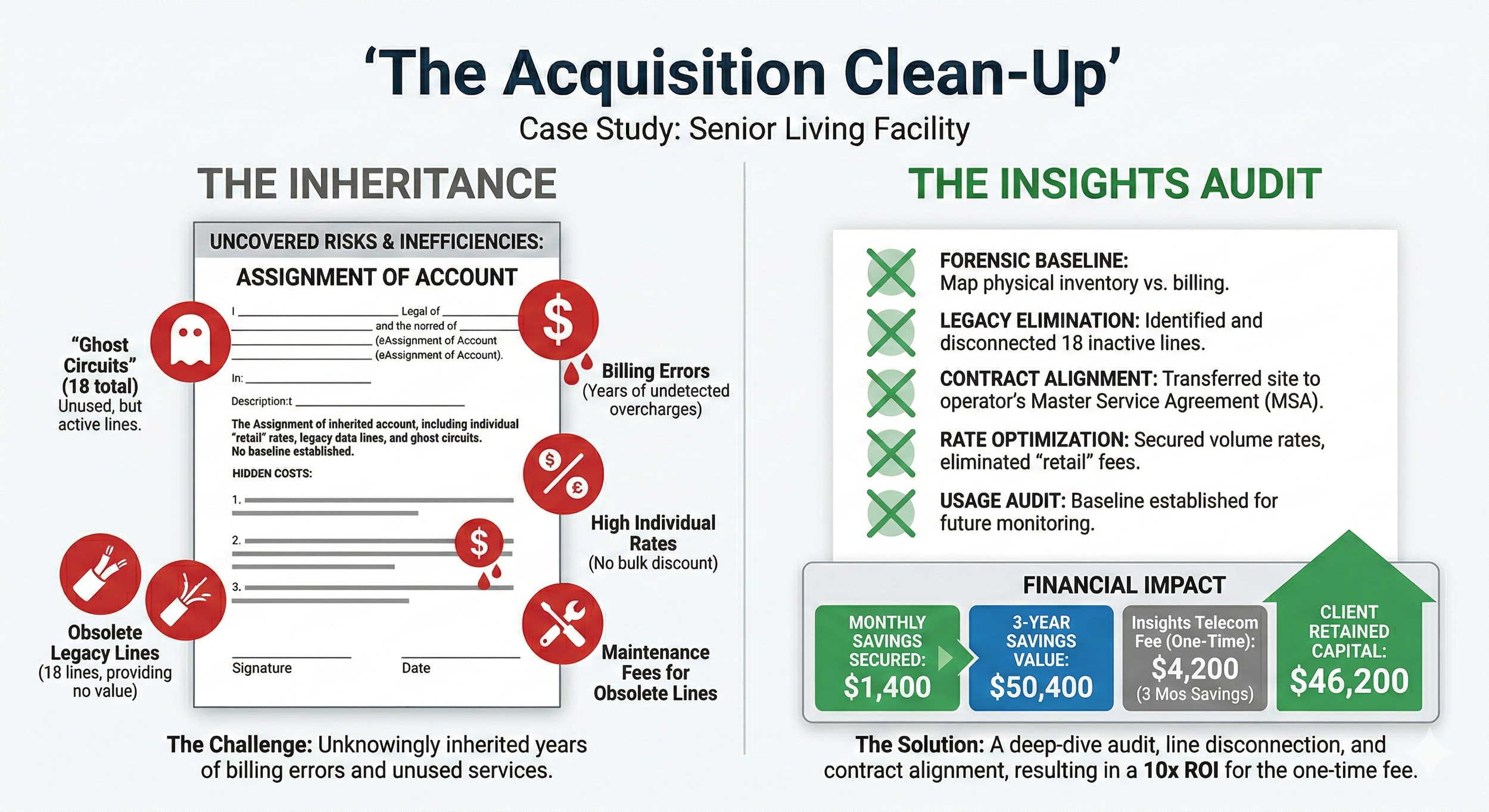The Challenge A Senior Living operator acquired a new facility and signed a standard "Account Assignment" form to take over the existing telecom services. While this kept the phones and internet running, the new owner unknowingly inherited years of billing errors and unused services from the previous occupant. Because there was no baseline of what was actually needed, they began paying for "ghost circuits" and legacy data lines that provided no value to the community.